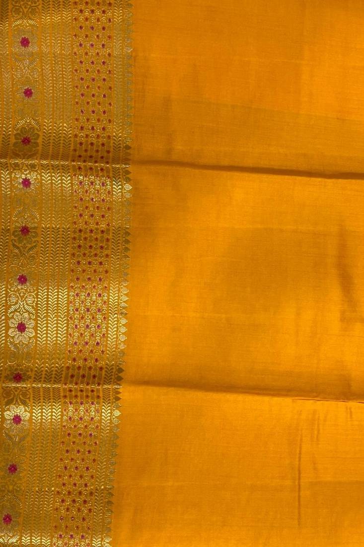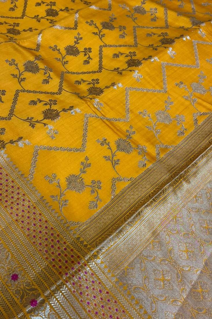 Banarasi pure silk chiniya saree in mustard colour with floral zari zig-zag pattern with red colour meenakari