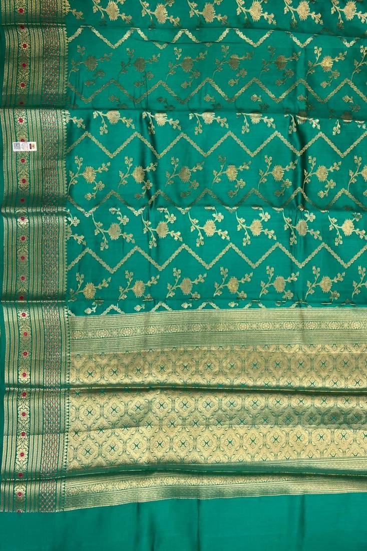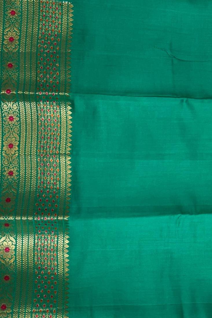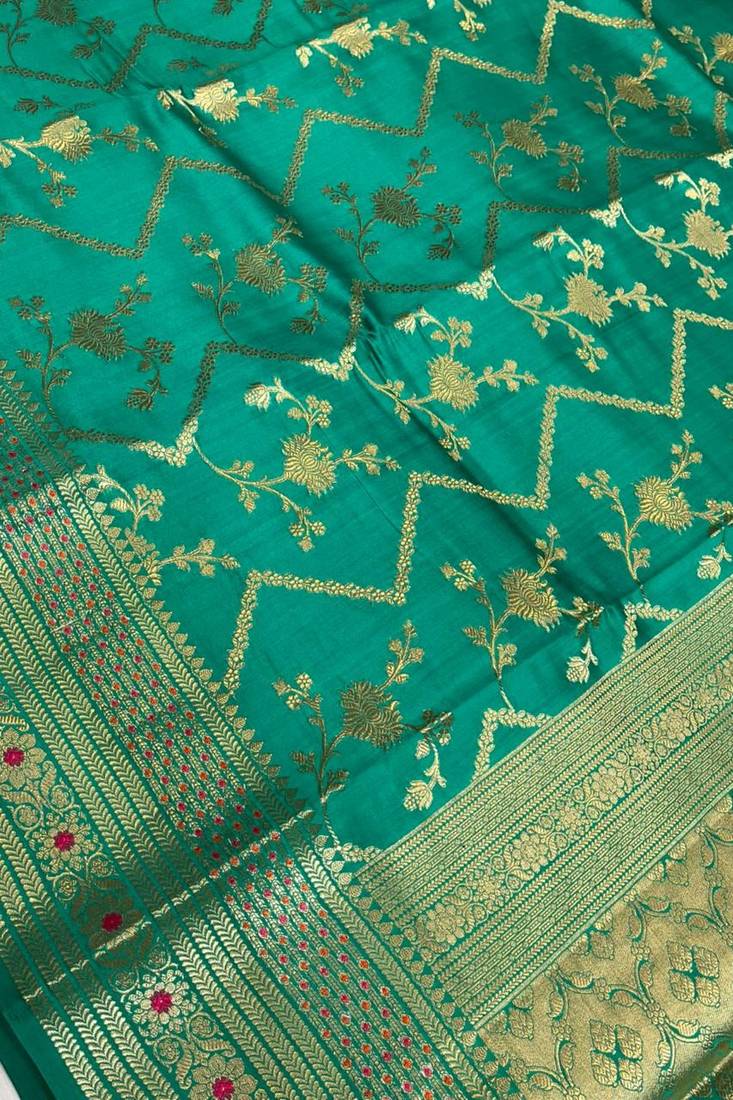 | Product Name | Banarasi Pure Silk Chiniya Saree In Teal Green Colour With Floral Zari Zig Zag Pattern With Red Colour Meenakari | |