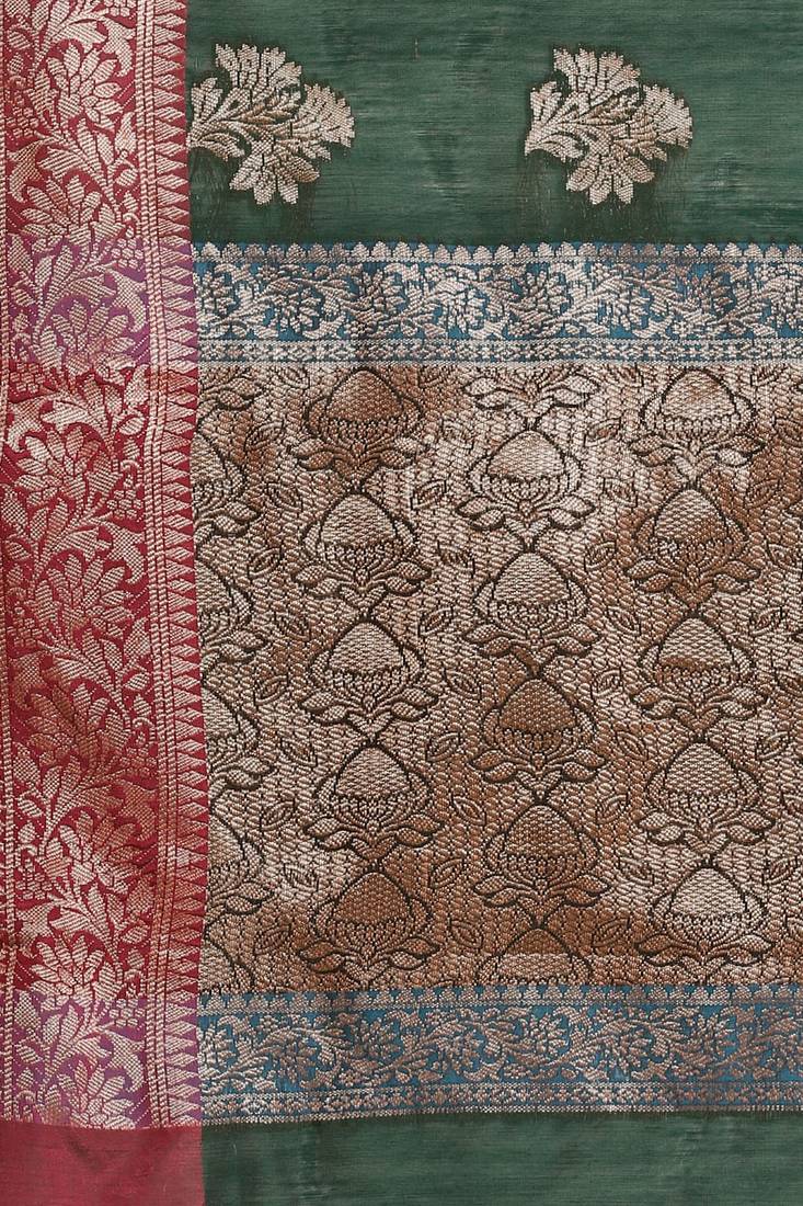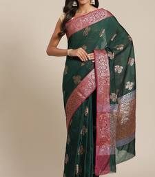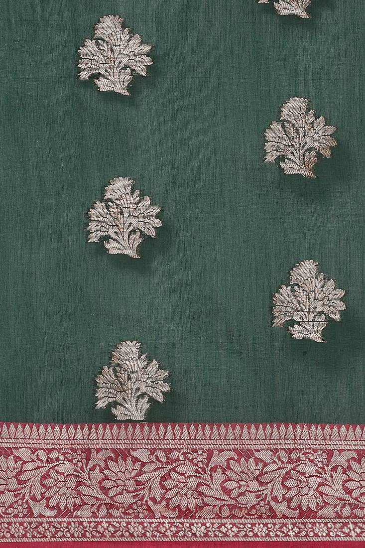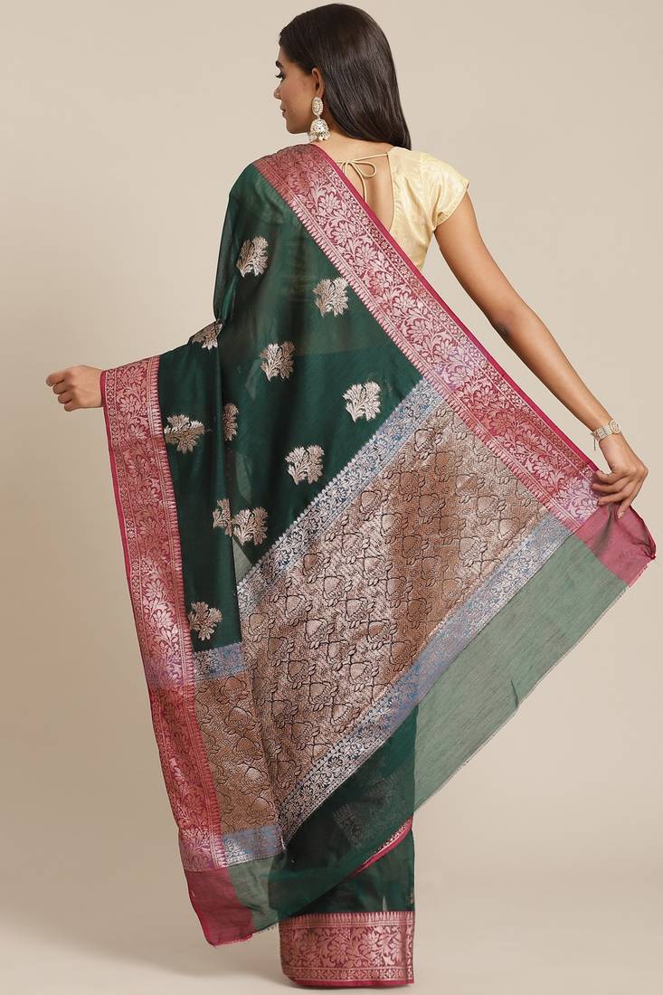 Banarasi silk blend cotton saree in bottle green colour with zari work