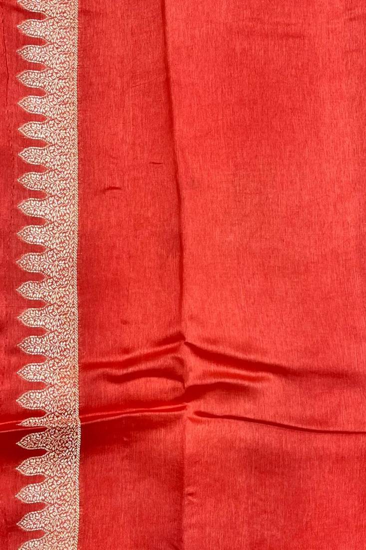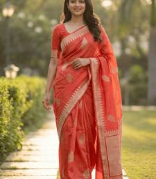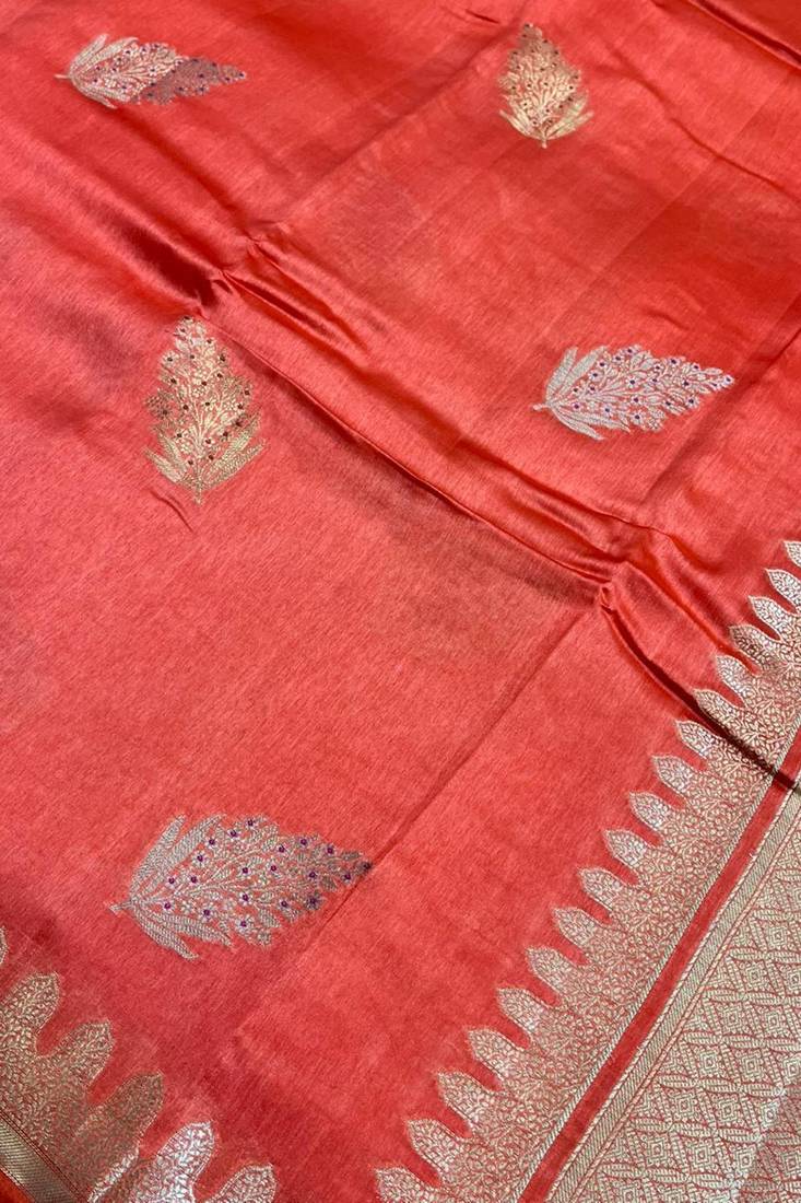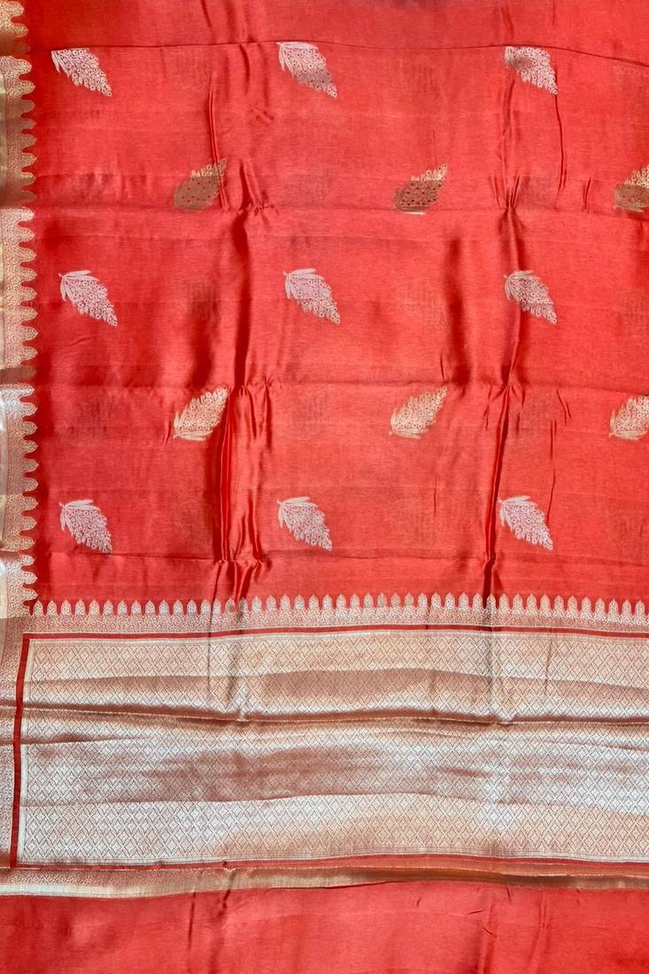 Banarasi viscose silk saree in orange colour with leaf zari meenakari work