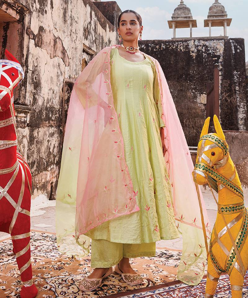| Product Description | Fresh And Vibrant, This Light Green Embroidered Chanderi Anarkali Set Features Intricate Detailing With A Subtle Sheen. The Flared Silhouette Enhances Its Elegance, Making It Perfect For Festive Wear. A Lively And Graceful Ensemble That Adds A Modern Twist To Traditional Style.