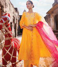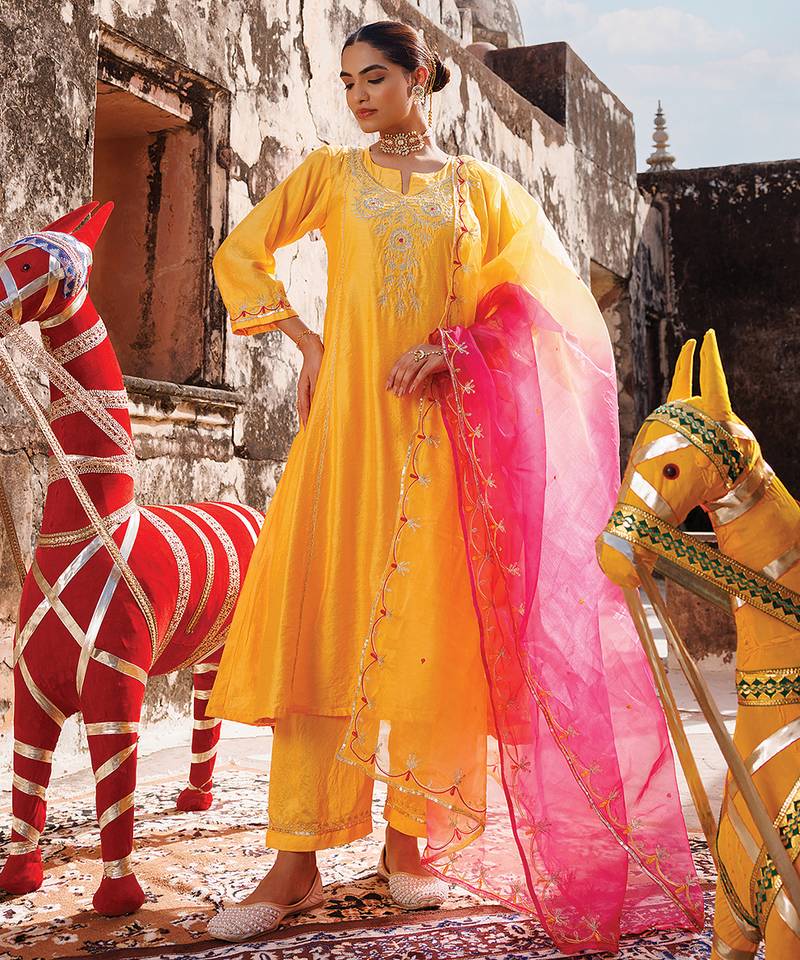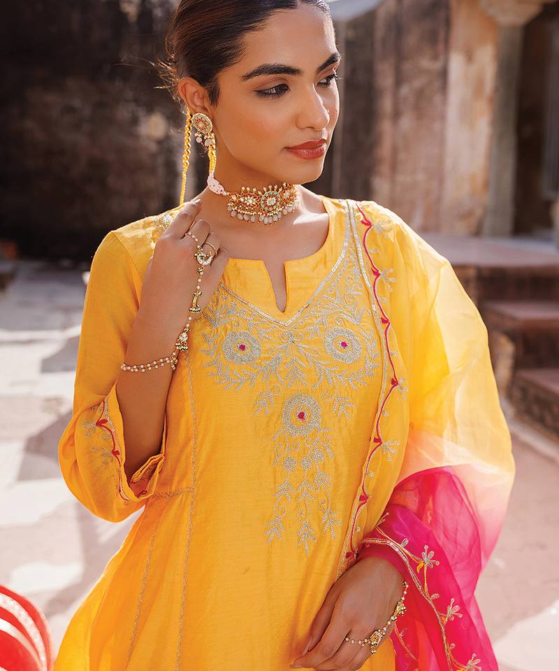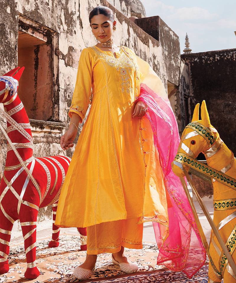 | Product Description | This Yellow Embroidered Chanderi Anarkali Set Radiates Warmth And Elegance. The Detailed Embroidery And Flowy Silhouette Create A Graceful Look, Perfect For Festive Occasions. Crafted In Lightweight Fabric, It Ensures Comfort While Offering A Vibrant And Traditional Appeal.