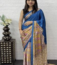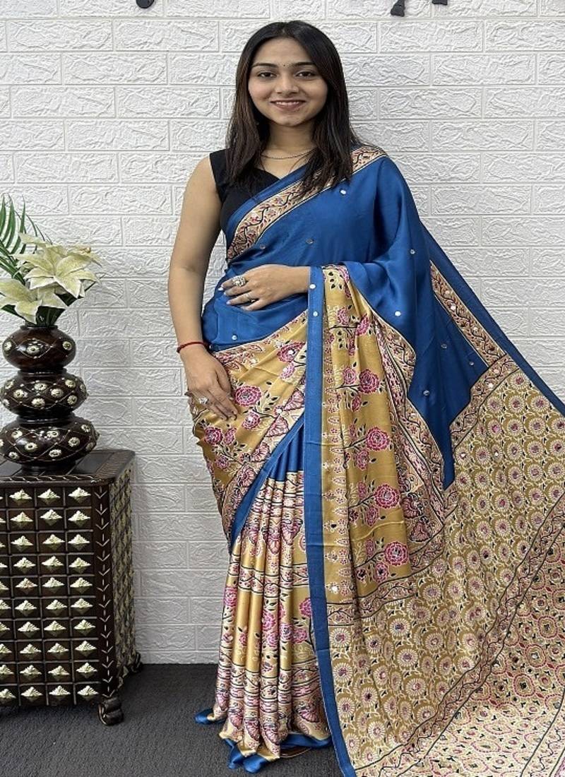 Blue color heavy mirror work satin silk saree