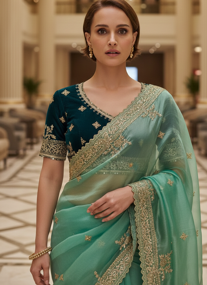 | Product Name | Green Color Sequins And Jaro Thread Embroidery Work Satin Silk Saree | |
