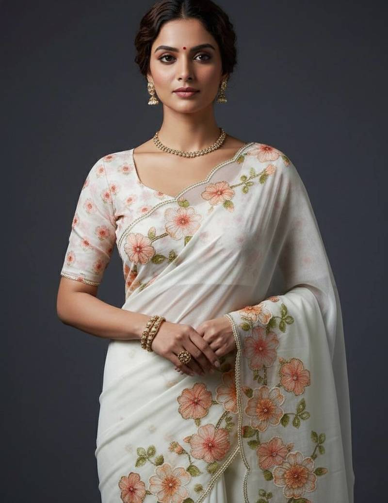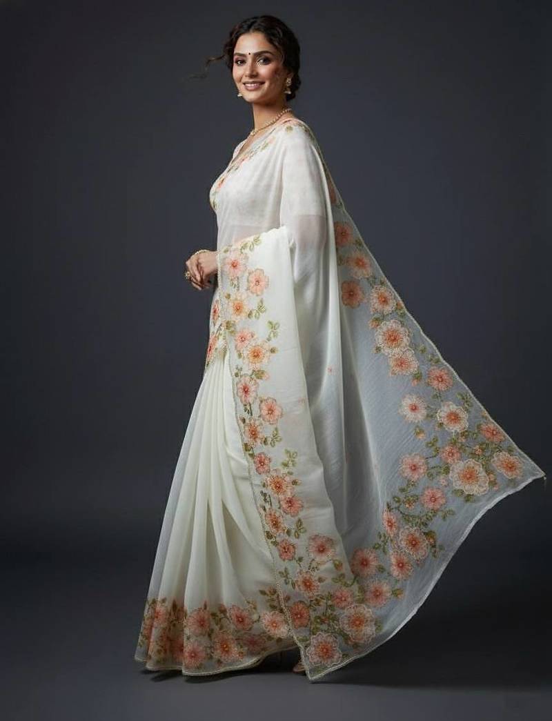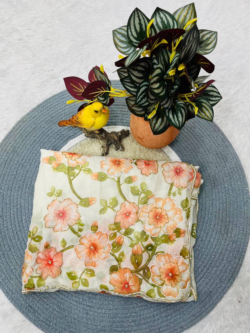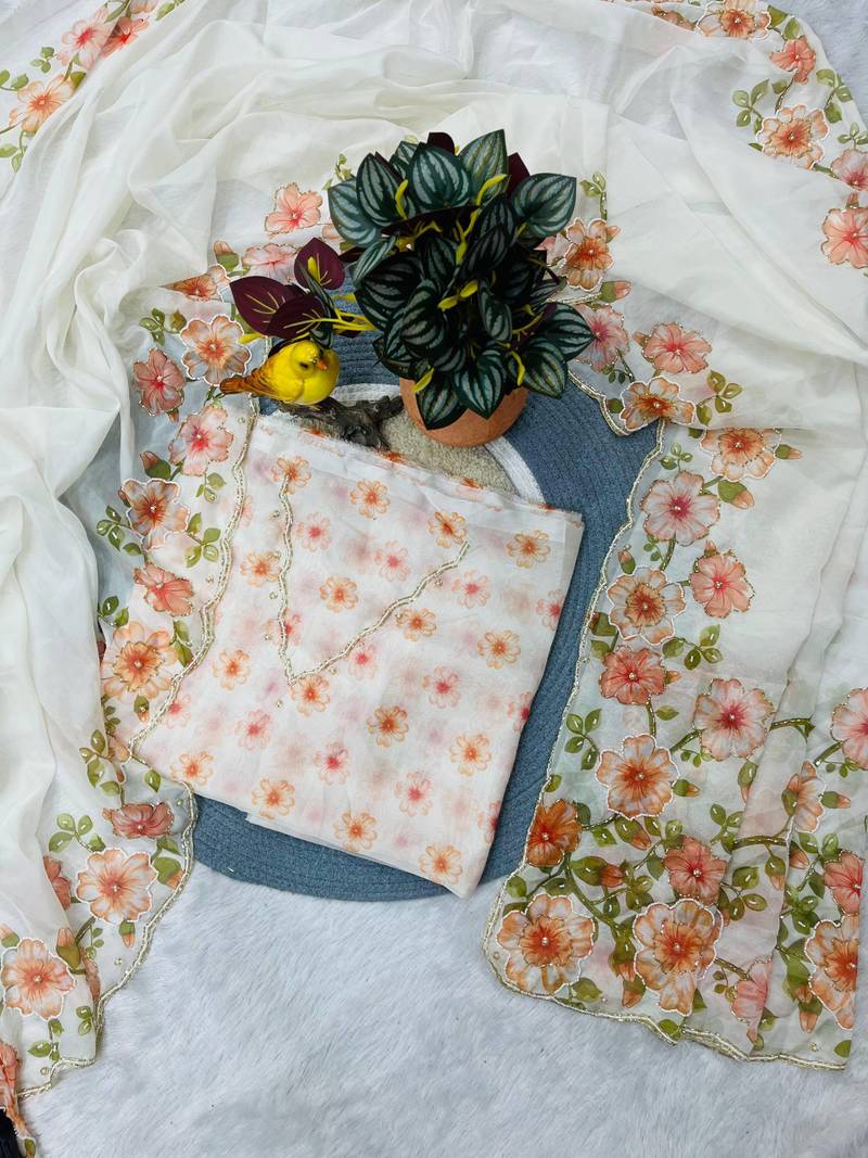| Product Name | Light Orange Color Floral Print With Pearls And Pipe Hand Work Organza Saree | |