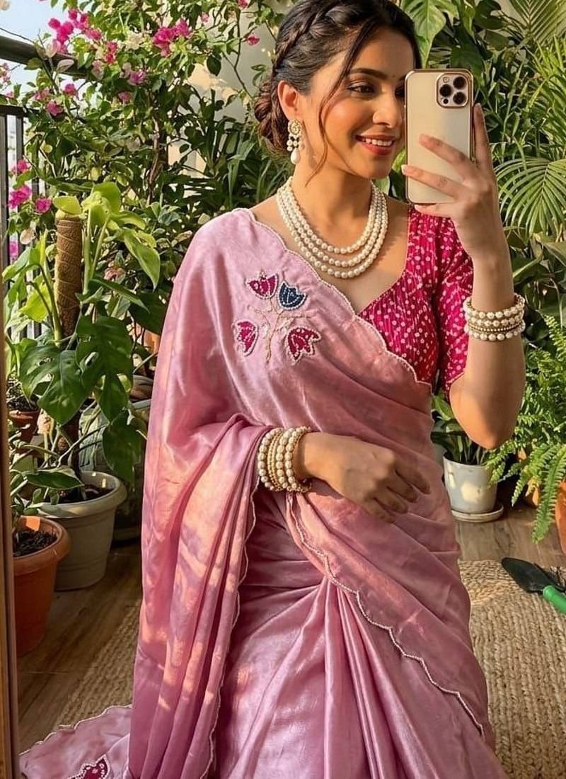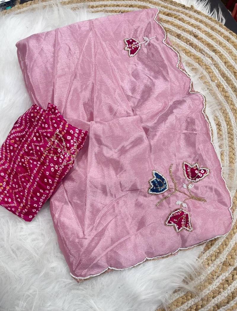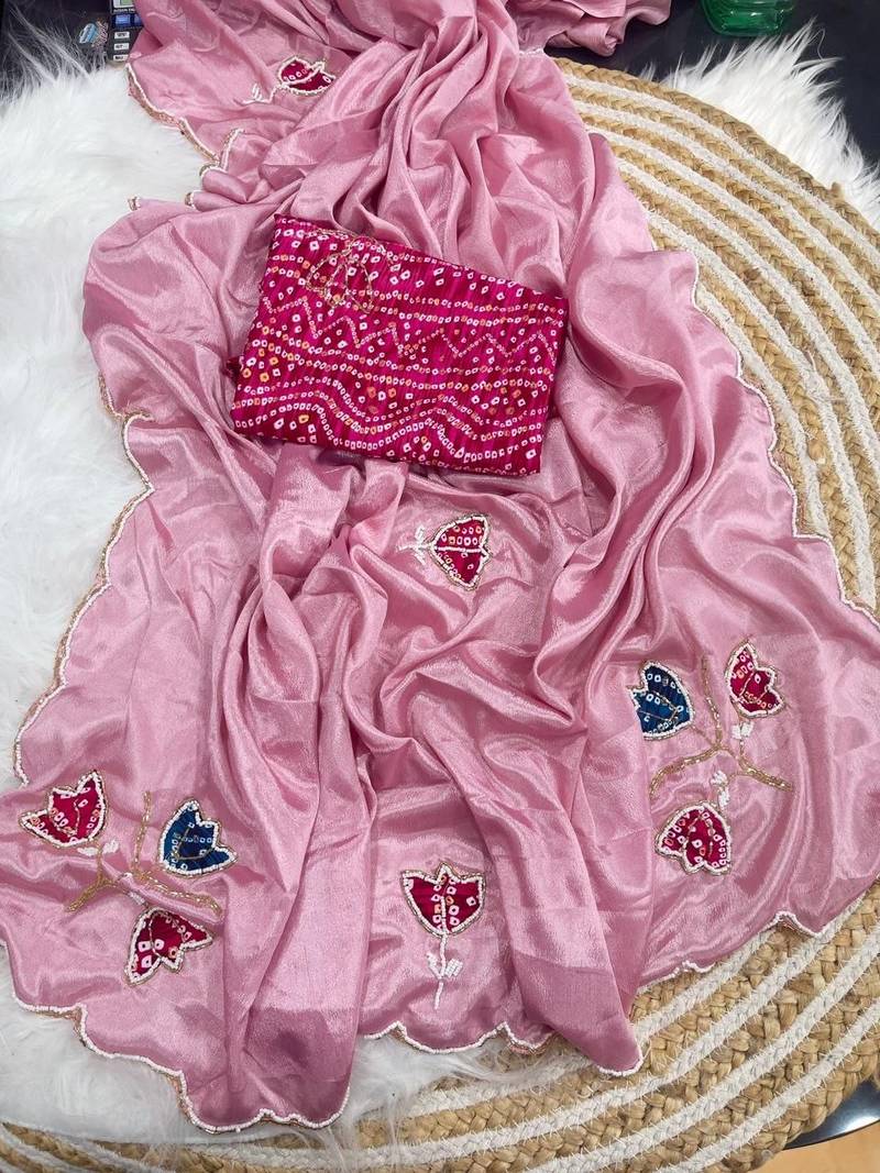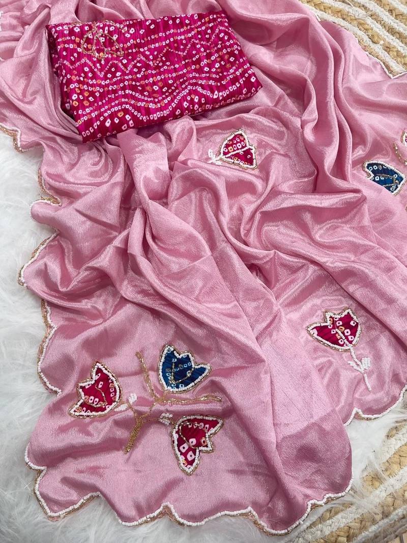 Pink color hand cutdana bandhni and butta work silk saree