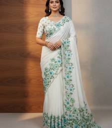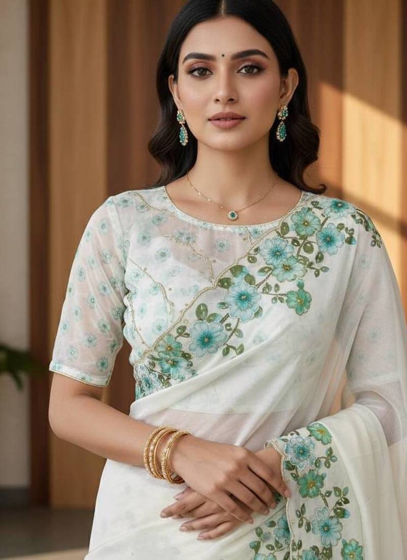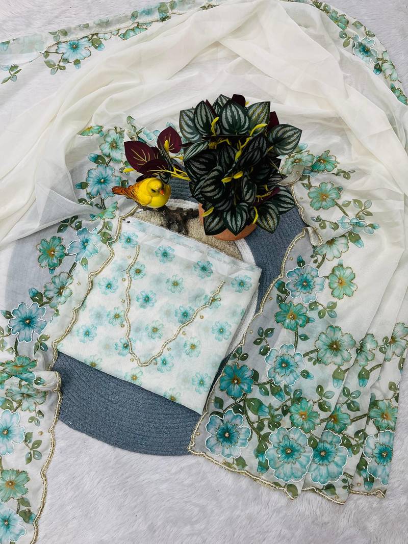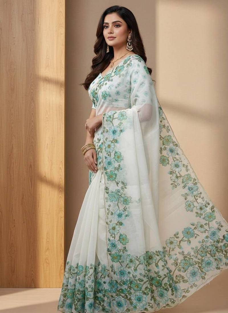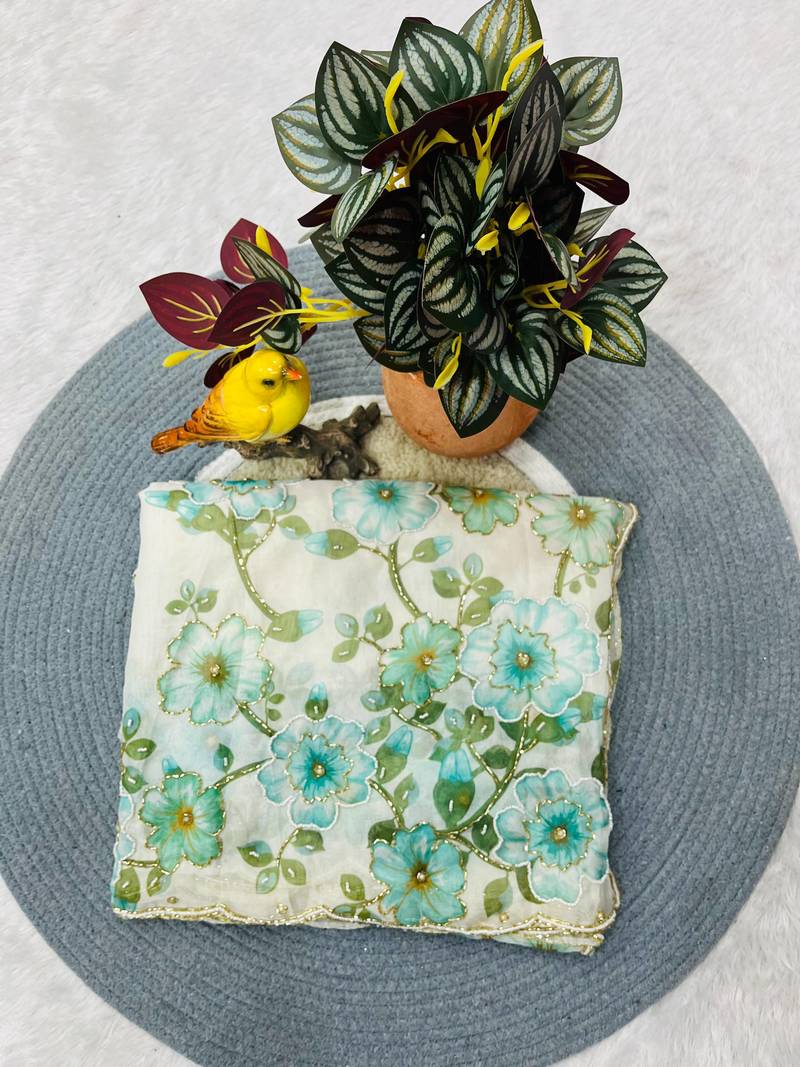 | Product Name | Teal Color Floral Print With Pearls And Pipe Hand Work Organza Saree | |