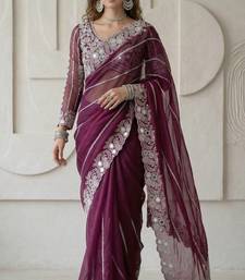 Wine color embroidery work of malti color thread with real mirror faux georgette saree