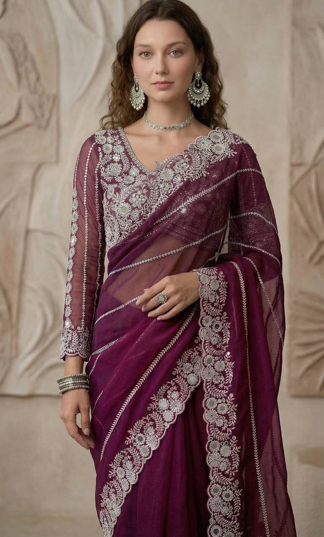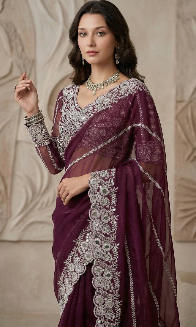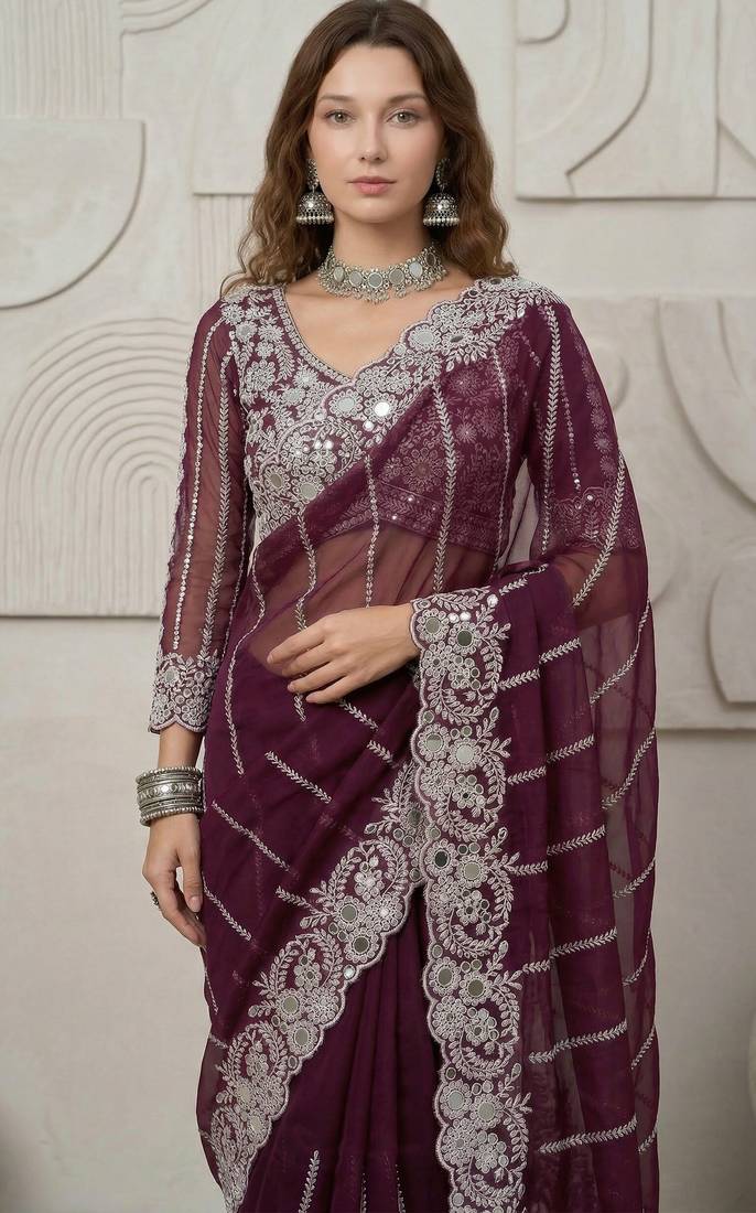 | Product Name | Wine Color Embroidery Work Of Malti Color Thread With Real Mirror Faux Georgette Saree | |