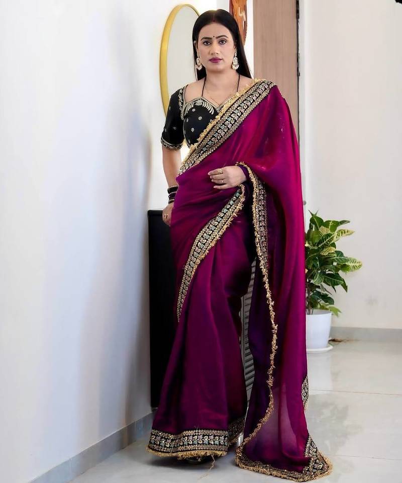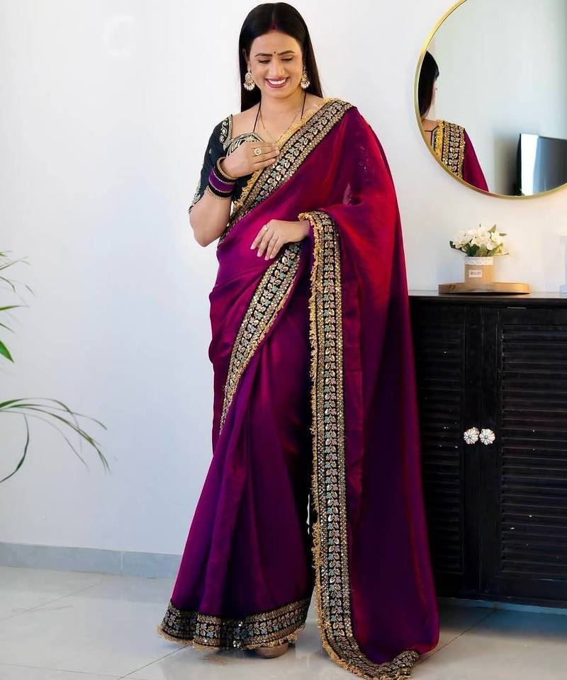 | Product Name | Wine Color Thread With Jari Dori And Sequins Work Satin Silk Saree | |