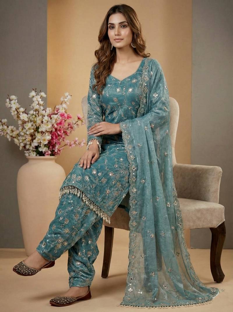 | Product Name | Blue Designer Heavy Fandy Crush Silk Sequins Embroidered Work Readymade Suit | |