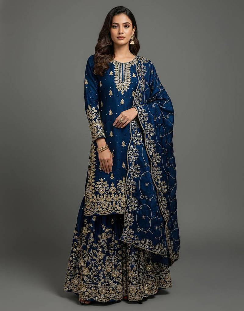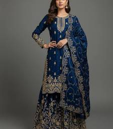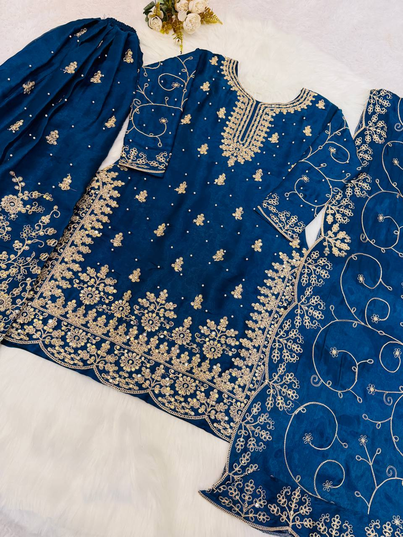 Blue designer pure gmy silk sequins embroidered work readymade suit stitched