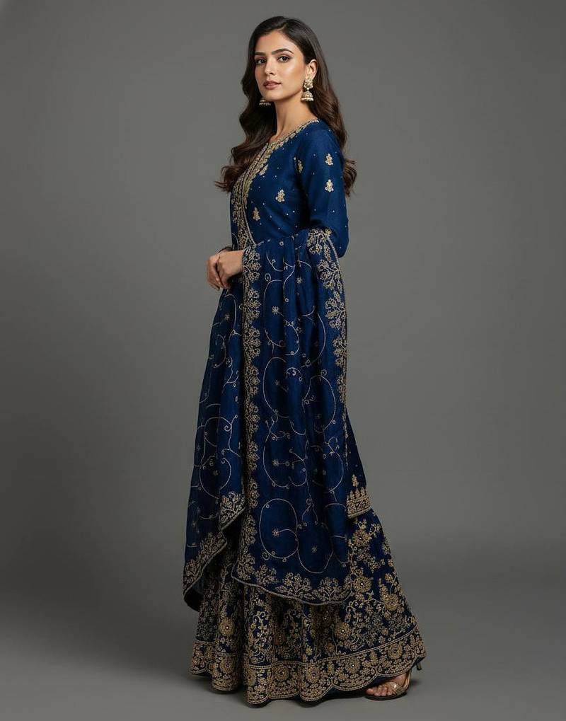 | Product Name | Blue Designer Pure Gmy Silk Sequins Embroidered Work Readymade Suit | |