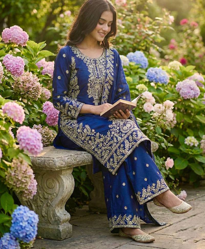 | Product Name | Blue Designer Pure Gmy Silk Sequins Embroidered Work Readymade Suit | |