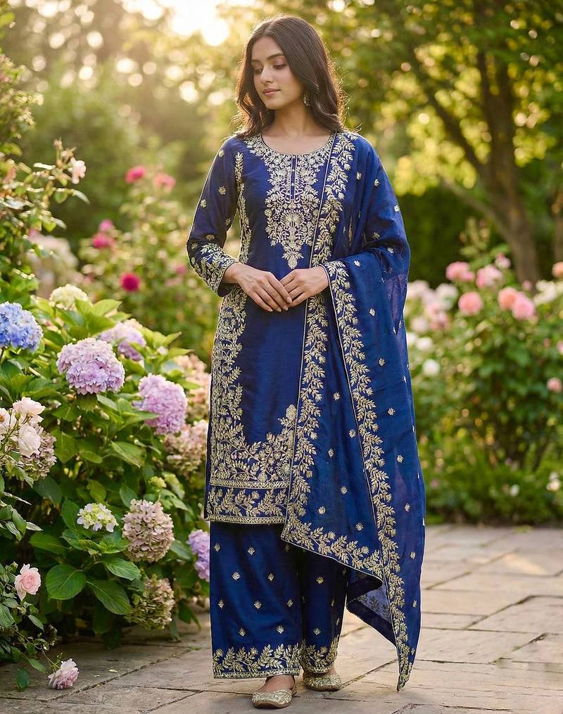 Blue designer pure gmy silk sequins embroidered work readymade suit stitched