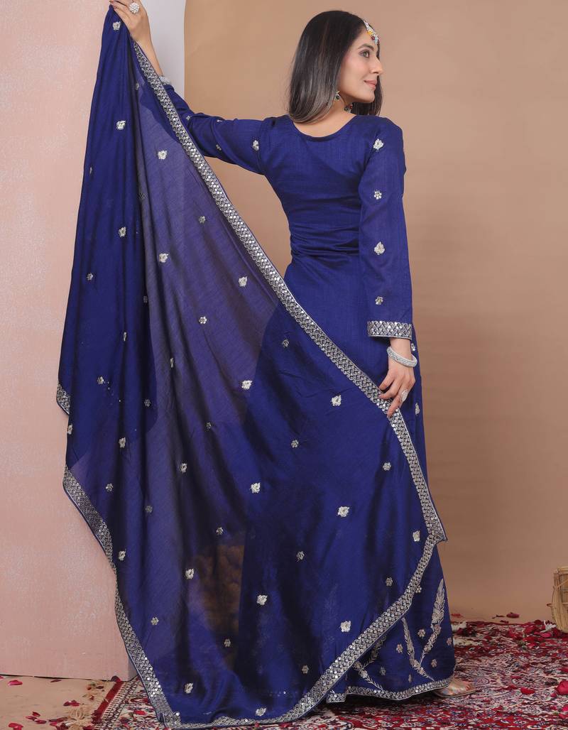 | Product Name | Blue Designer Vichitra Blooming Sequins Embroidered Work Readymade Suit | |