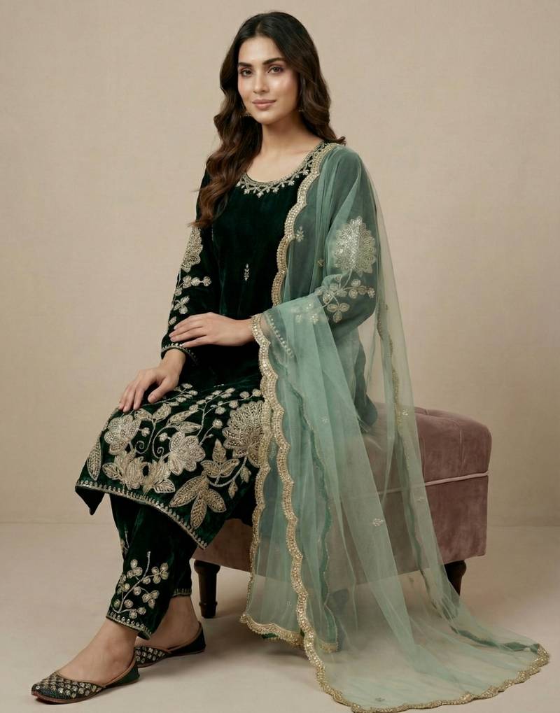 Green designer pure heavy viscous velvet sequins embroidered work readymade suit stitched
