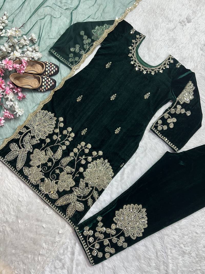 | Product Name | Green Designer Pure Heavy Viscous Velvet Sequins Embroidered Work Readymade Suit | |