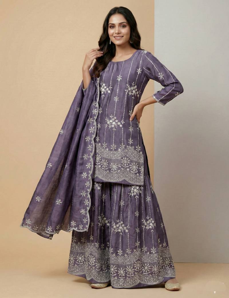 | Product Name | Light Purple Designer Chinon Sequins Embroidered Work Readymade Suit | |