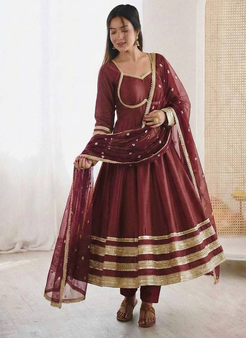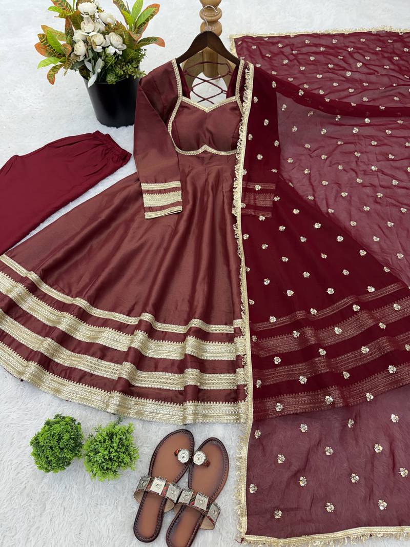 Maroon color designer cosmos gold silk lace work readymade suit stitched