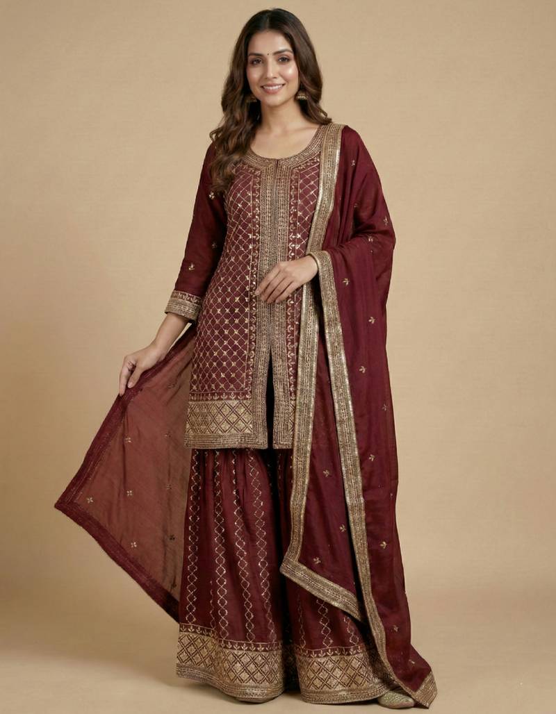 | Product Name | Maroon Designer Chinon Sequins Embroidered Work Readymade Suit | |