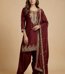 | • | Kameez | : | Color- Maroon / Fabric- Faux Silk |