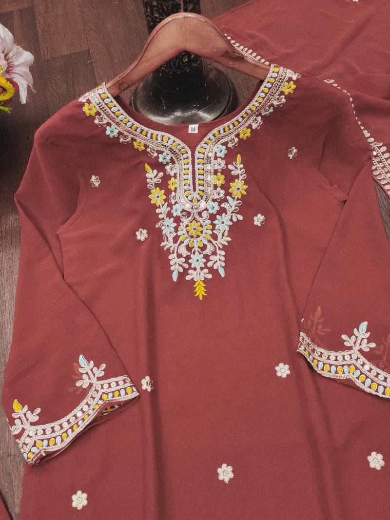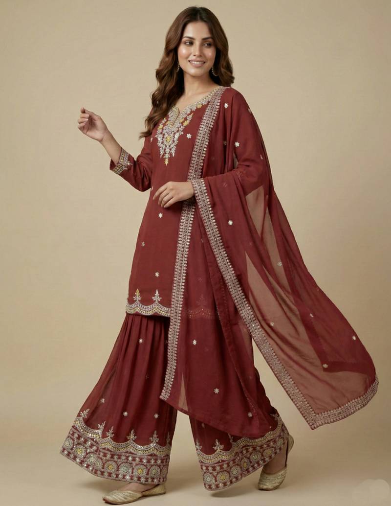 Maroon designer fox georgette sequins embroidered work readymade suit stitched
