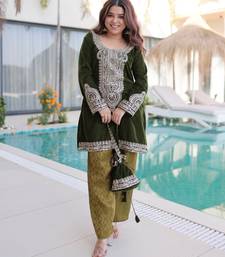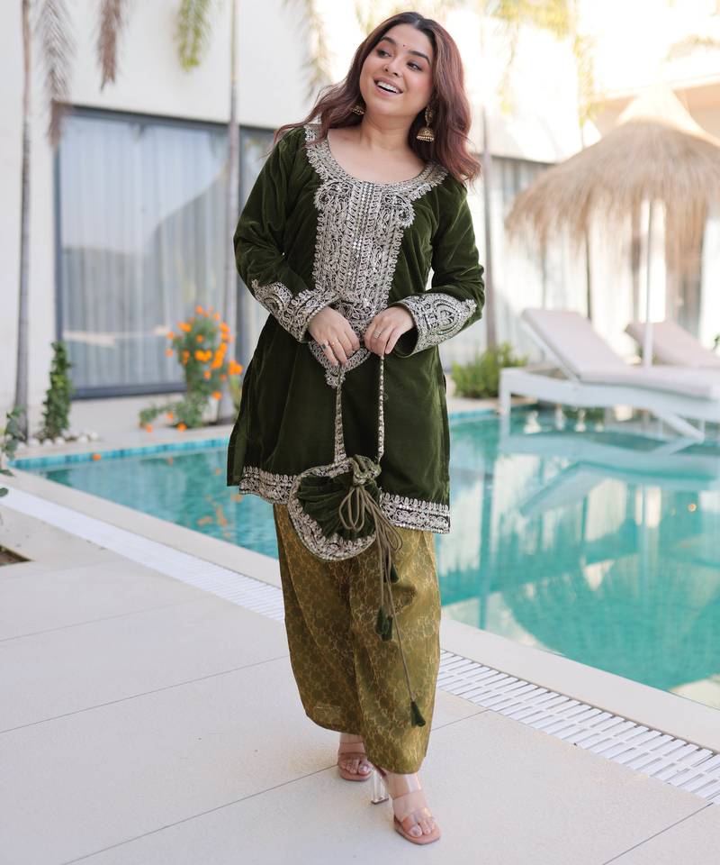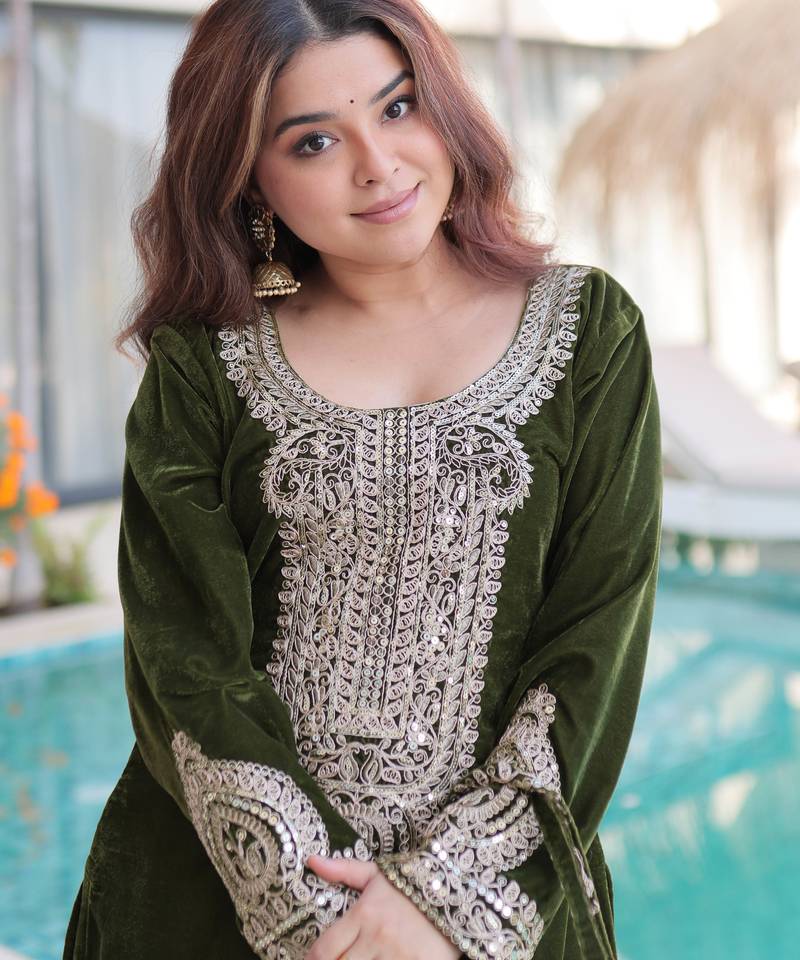 | Product Name | Mehendi Designer 9000 Velvet Zari & Embroidered Work Readymade Suit | |