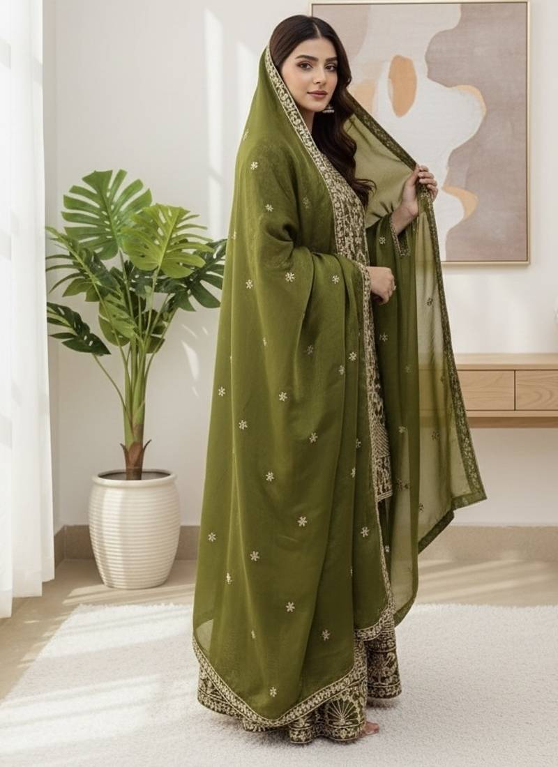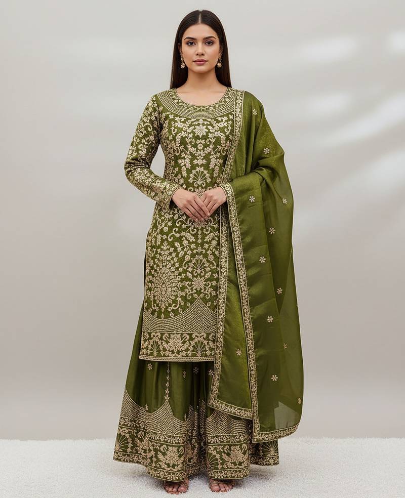 | Product Name | Mehendi Green Designer Heavy Gmy Silk Sequins Embroidered Work Readymade Suit | |