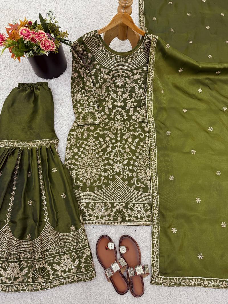 Mehendi green designer heavy gmy silk sequins embroidered work readymade suit stitched