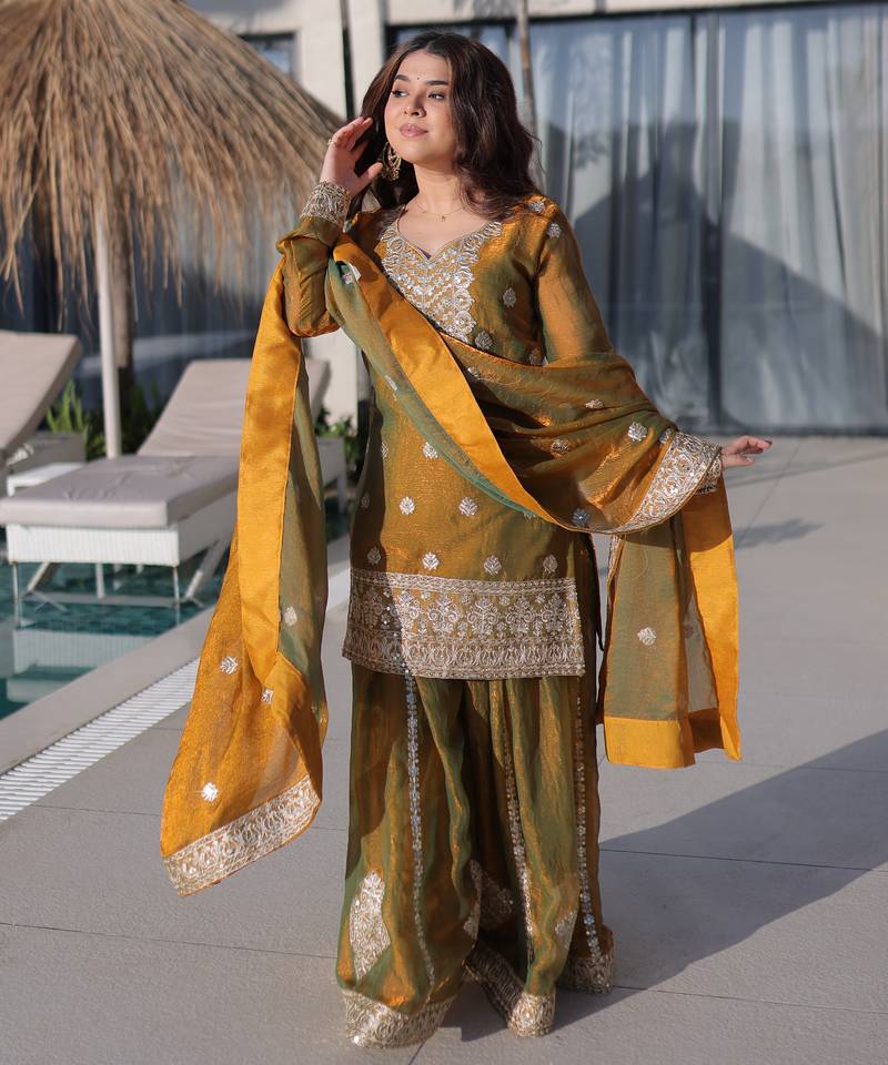 | Product Name | Mustard Color Designer Fendi Chiffon Sequins Embroidered Work Readymade Suit | |