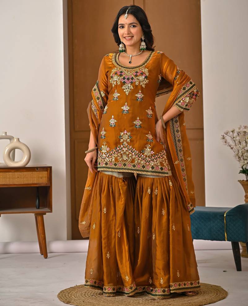 Mustard designer heavy fandy silk sequins embroidered work readymade suit