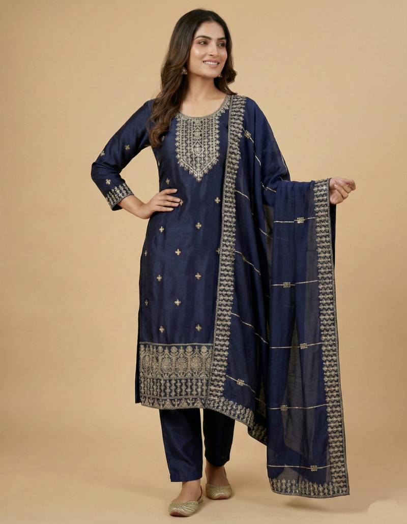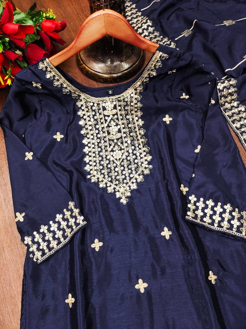 | Product Name | Navy Blue Designer Chinon Sequins Embroidered Work Readymade Suit | |