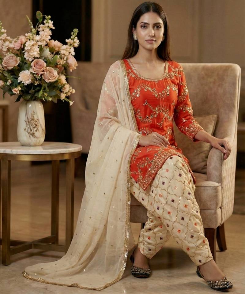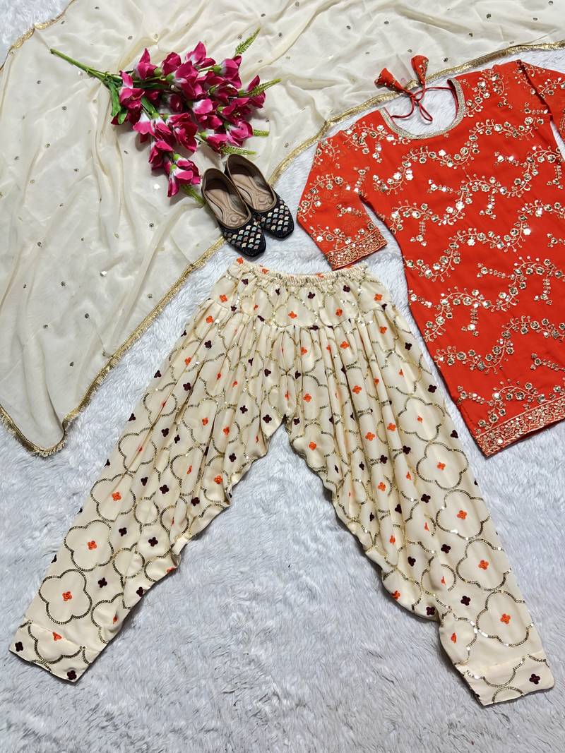 Product Name Orange Designer Faux Georgette Sequins Embroidered Work Readymade Suit