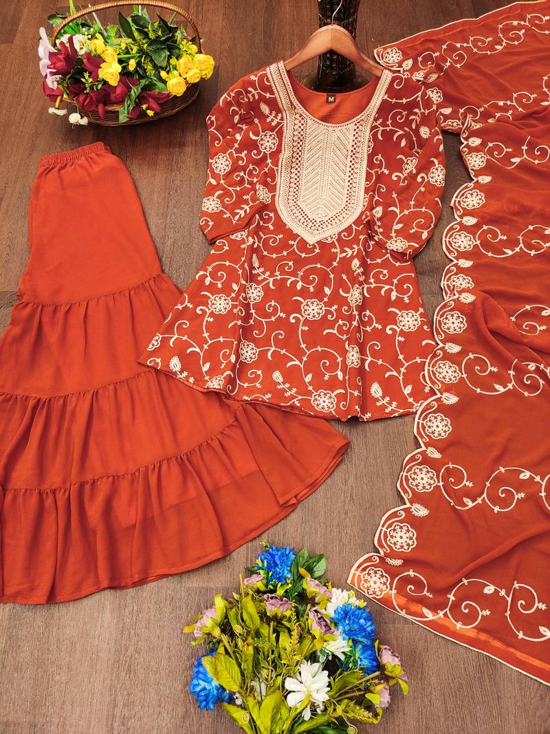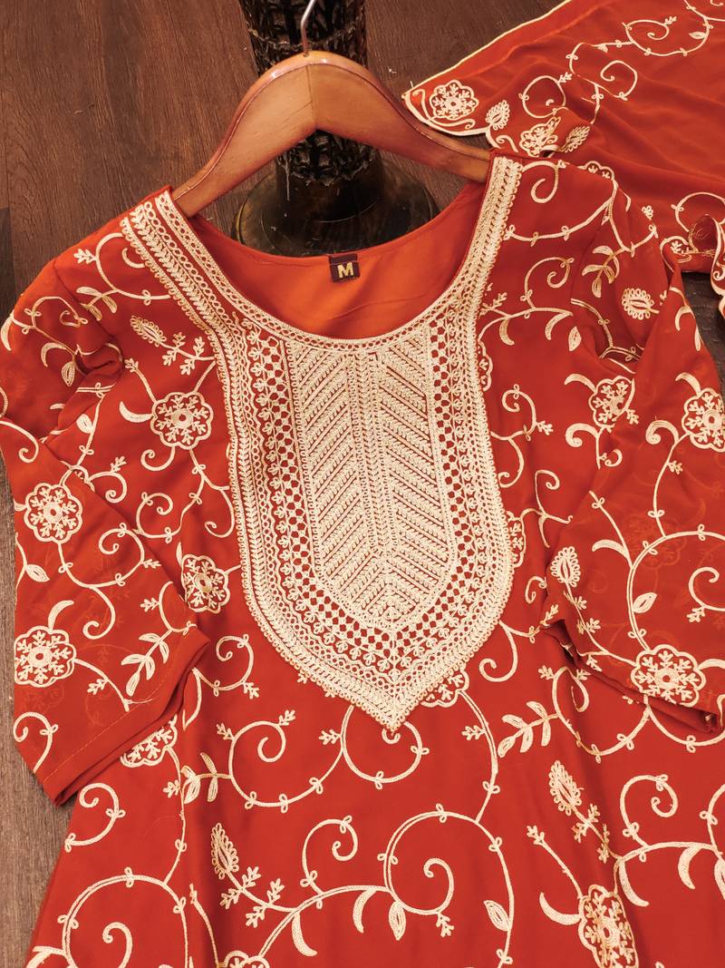 Orange designer fox georgette embroidered work readymade suit stitched