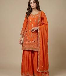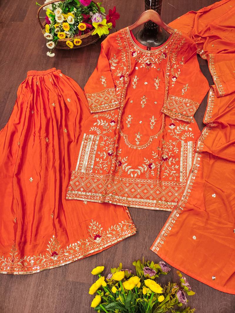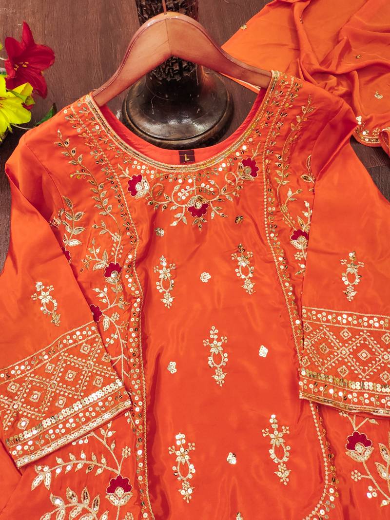 | Product Name | Orange Designer Natural Crepe Sequins Embroidered Work Readymade Suit | |
