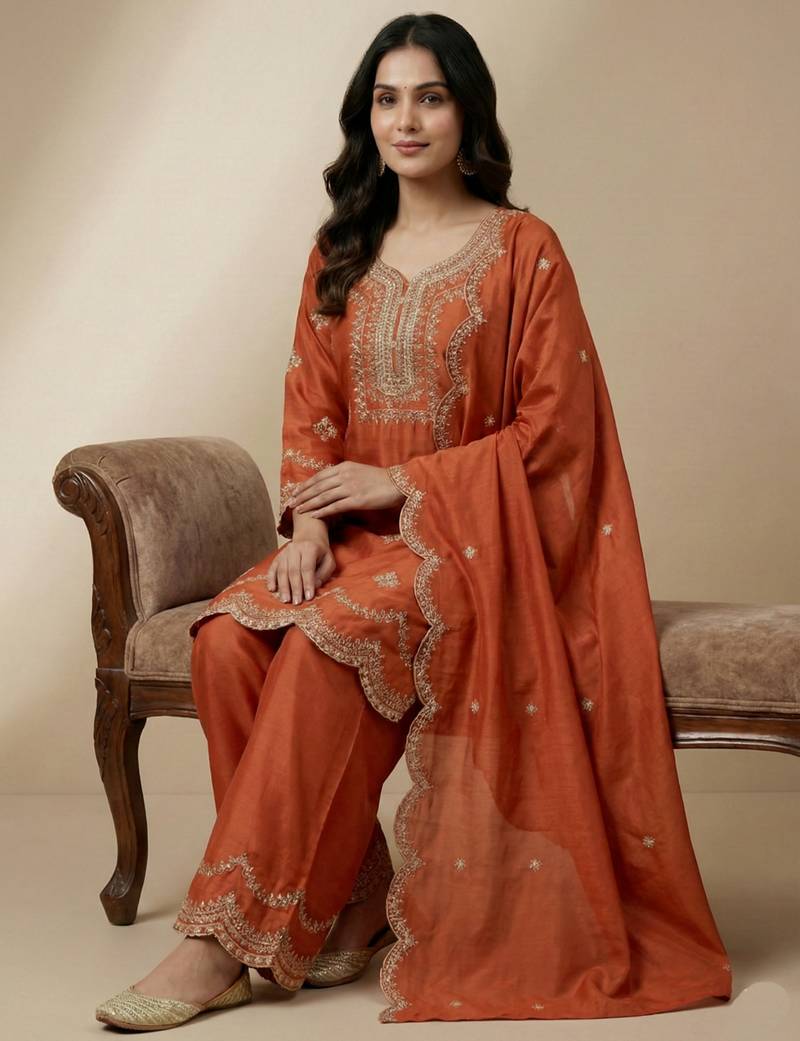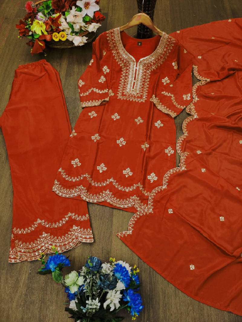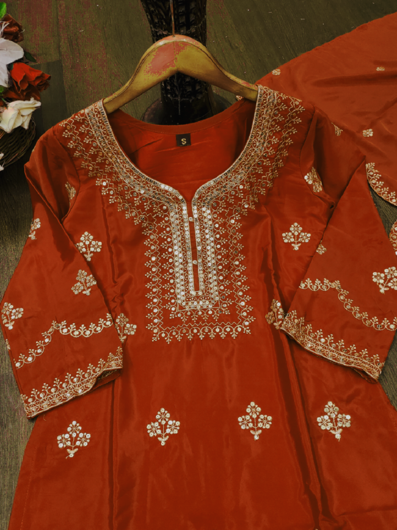 | Product Name | Orange Designer Natural Crepe Sequins Embroidered Work Readymade Suit | |