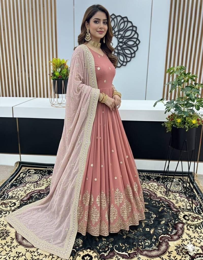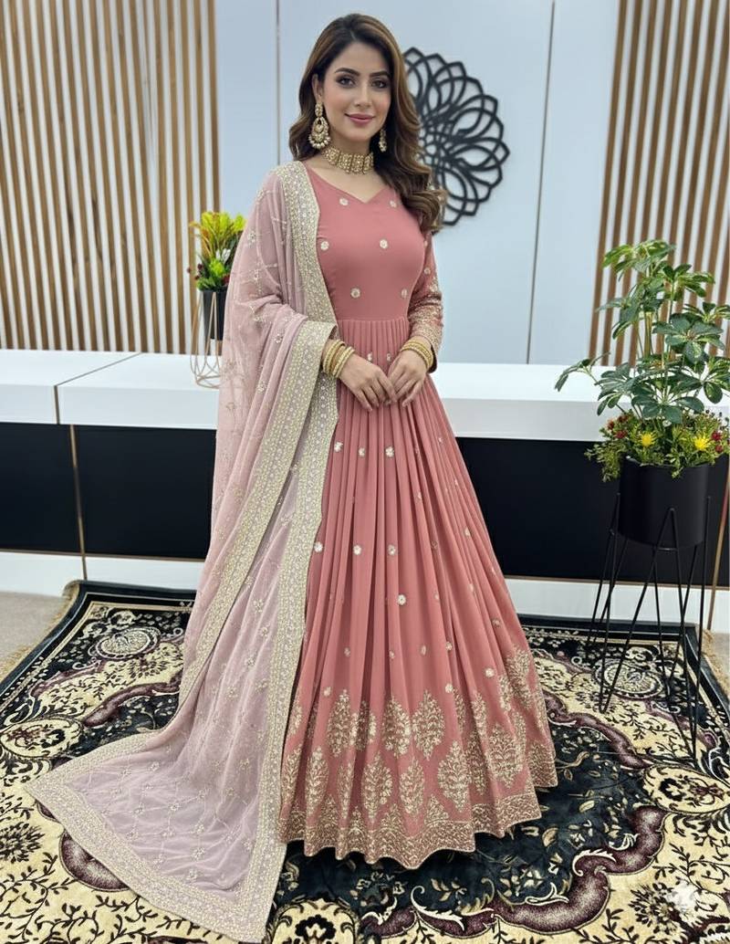 | Product Name | Peach Pink Designer Heavy Faux Georgette Sequins Embroidered Work Readymade Suit | |