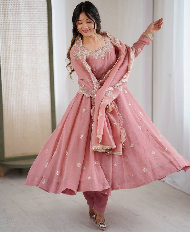 Pink designer crunchy silk sequins embroidered work readymade suit stitched