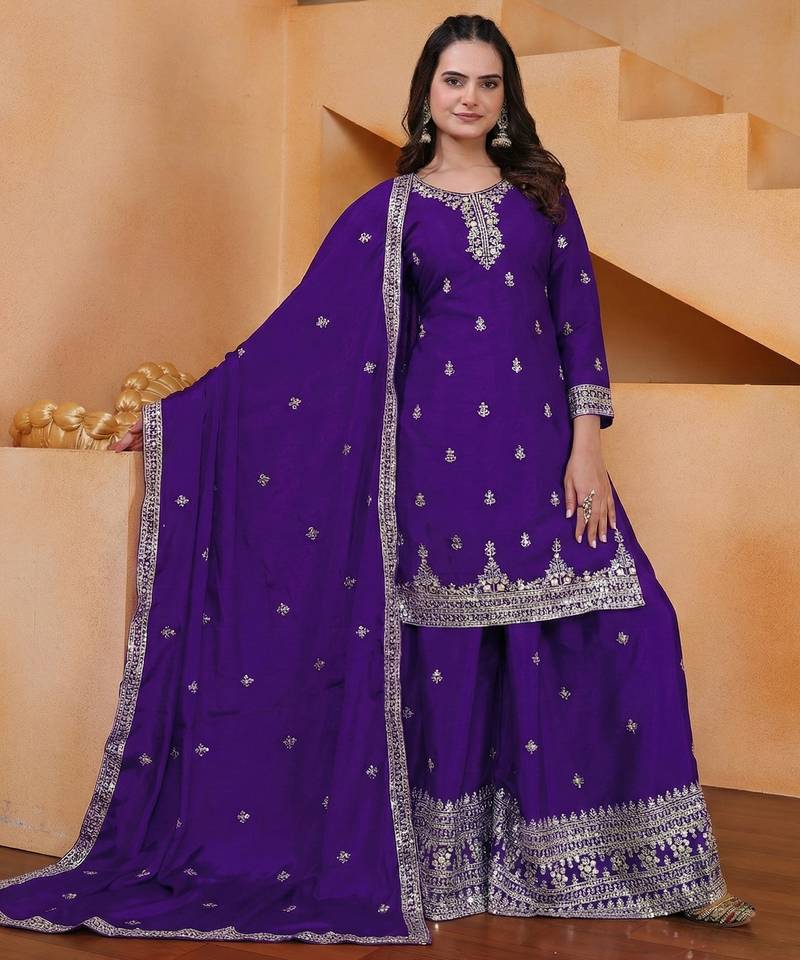 | Product Name | Purple Designer Chinon Sequins Embroidered Work Readymade Suit | |