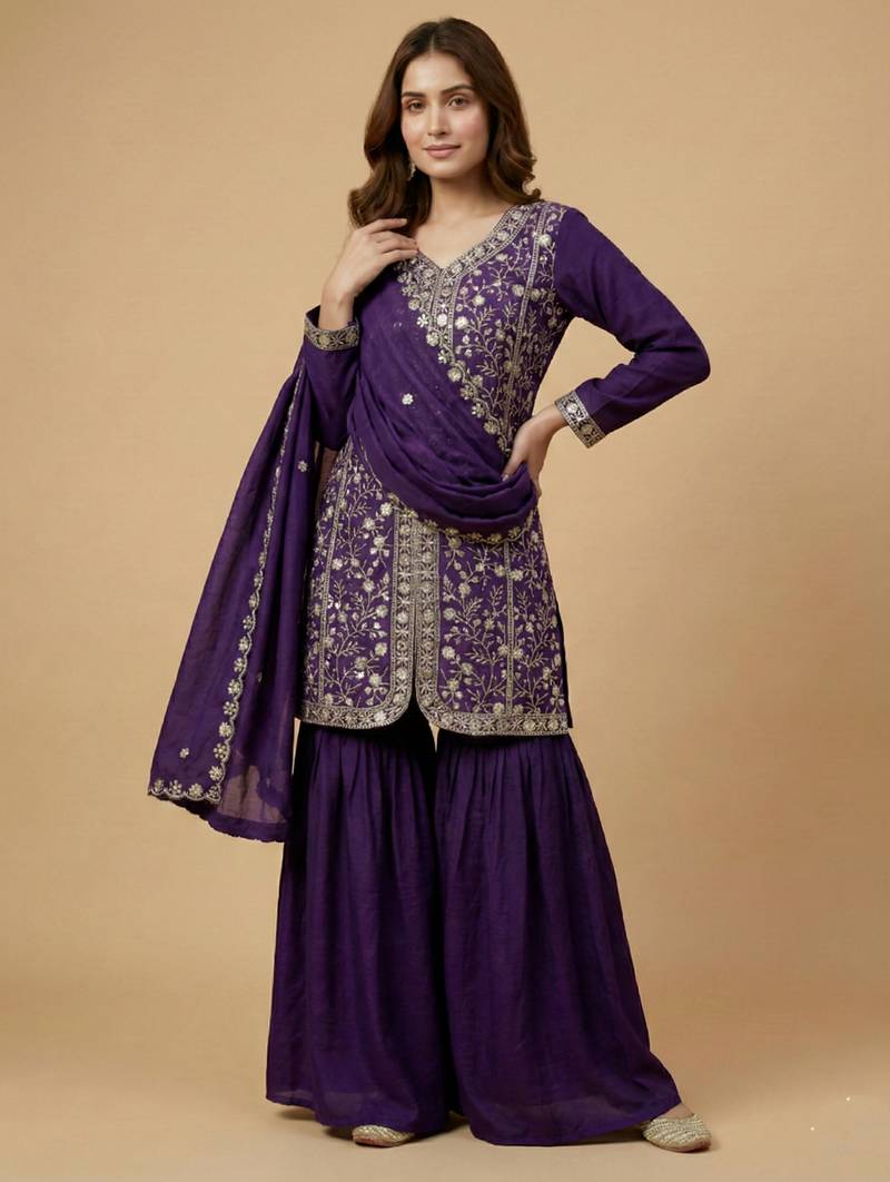 | Product Name | Purple Designer Chinon Sequins Embroidered Work Readymade Suit | |