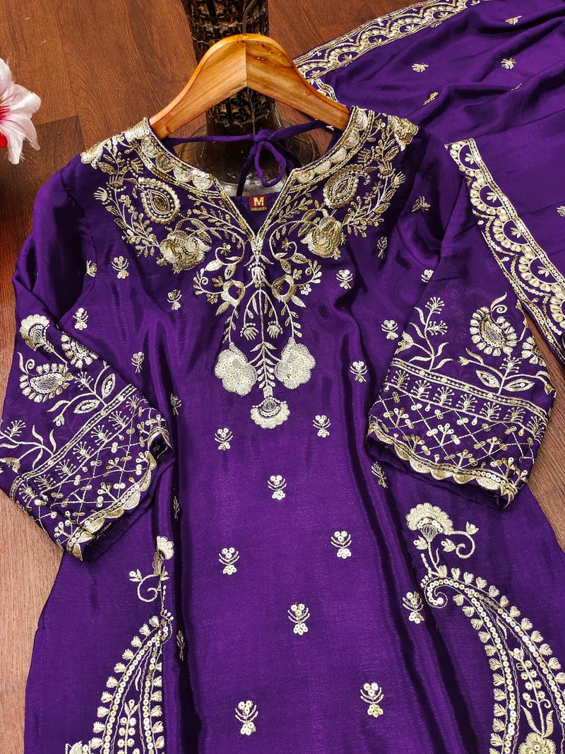 Purple designer chinon sequins embroidered work readymade suit stitched