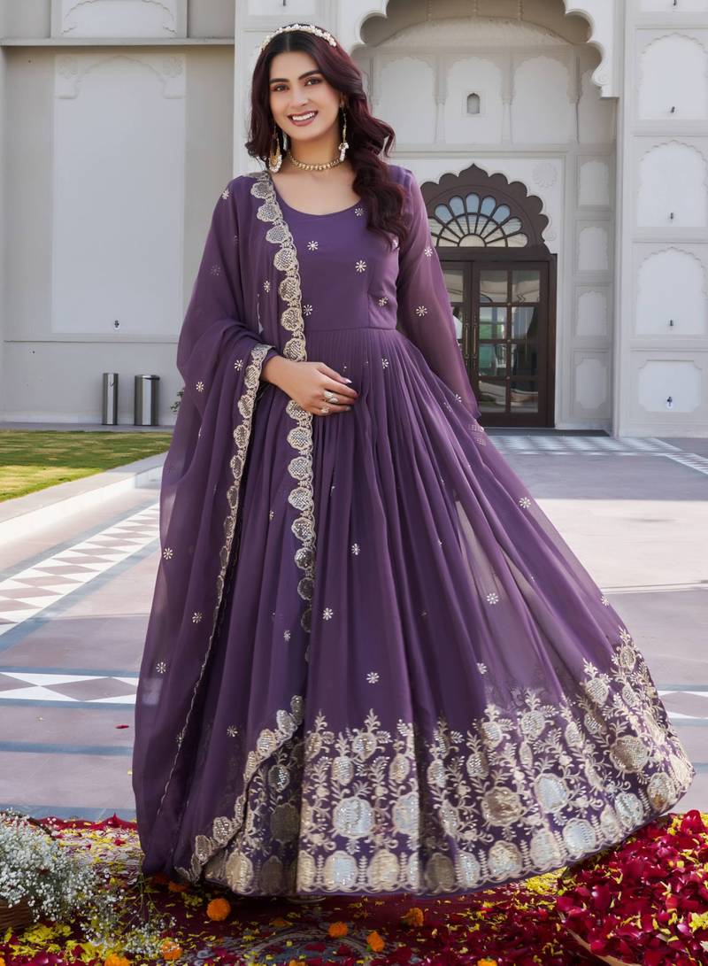 Purple designer fox georgette sequins embroidered work readymade suit stitched