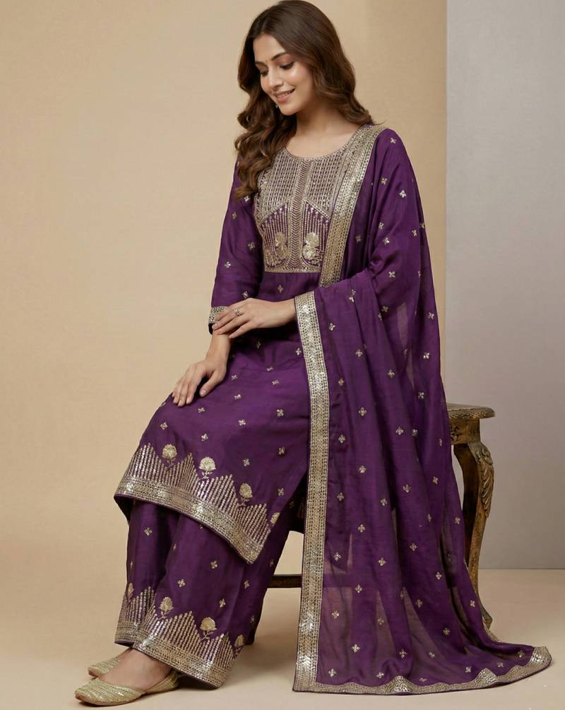 | Product Name | Purple Designer Natural Crepe Sequins Embroidered Work Readymade Suit | |