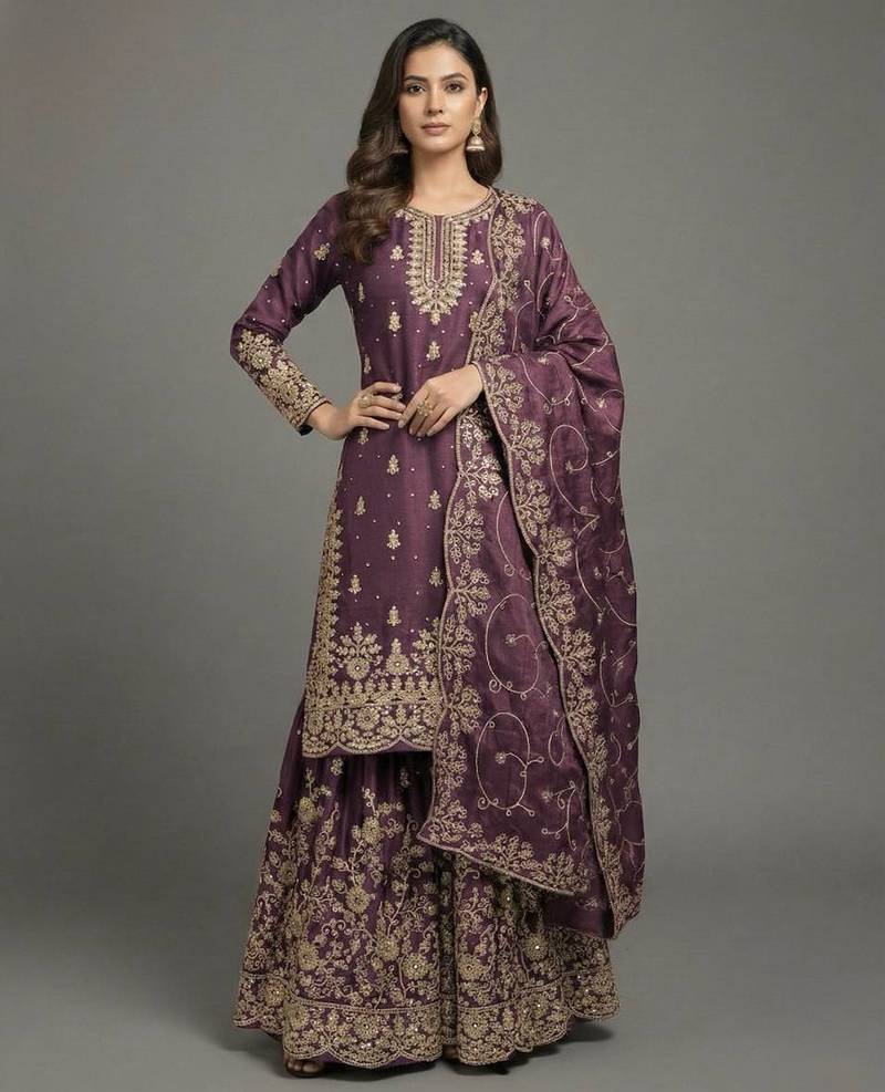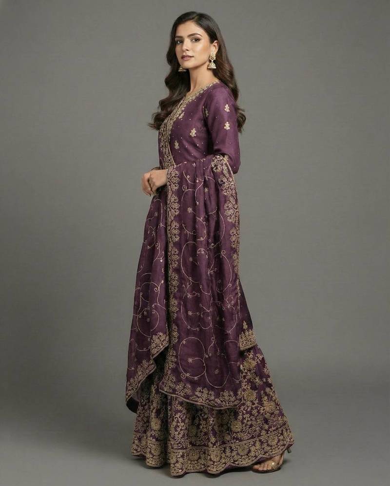 | Product Name | Purple Designer Pure Gmy Silk Sequins Embroidered Work Readymade Suit | |