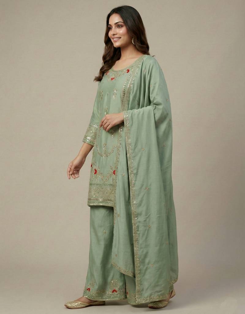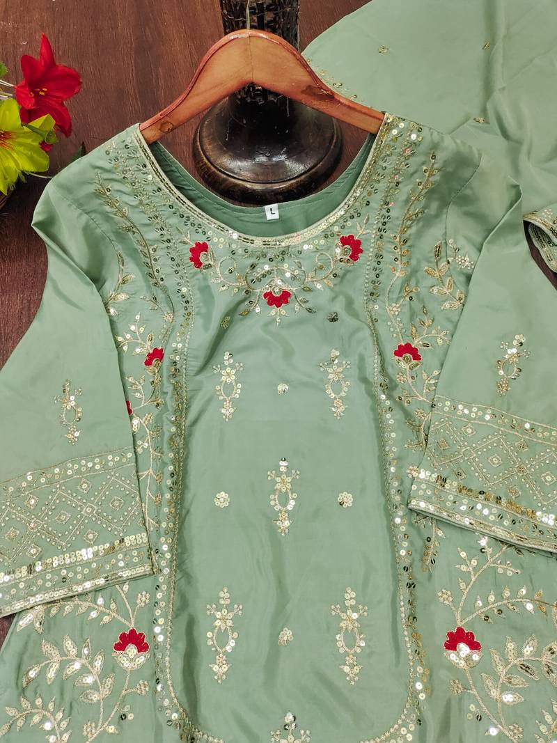 | Product Name | Sea Green Designer Natural Crepe Sequins Embroidered Work Readymade Suit | |