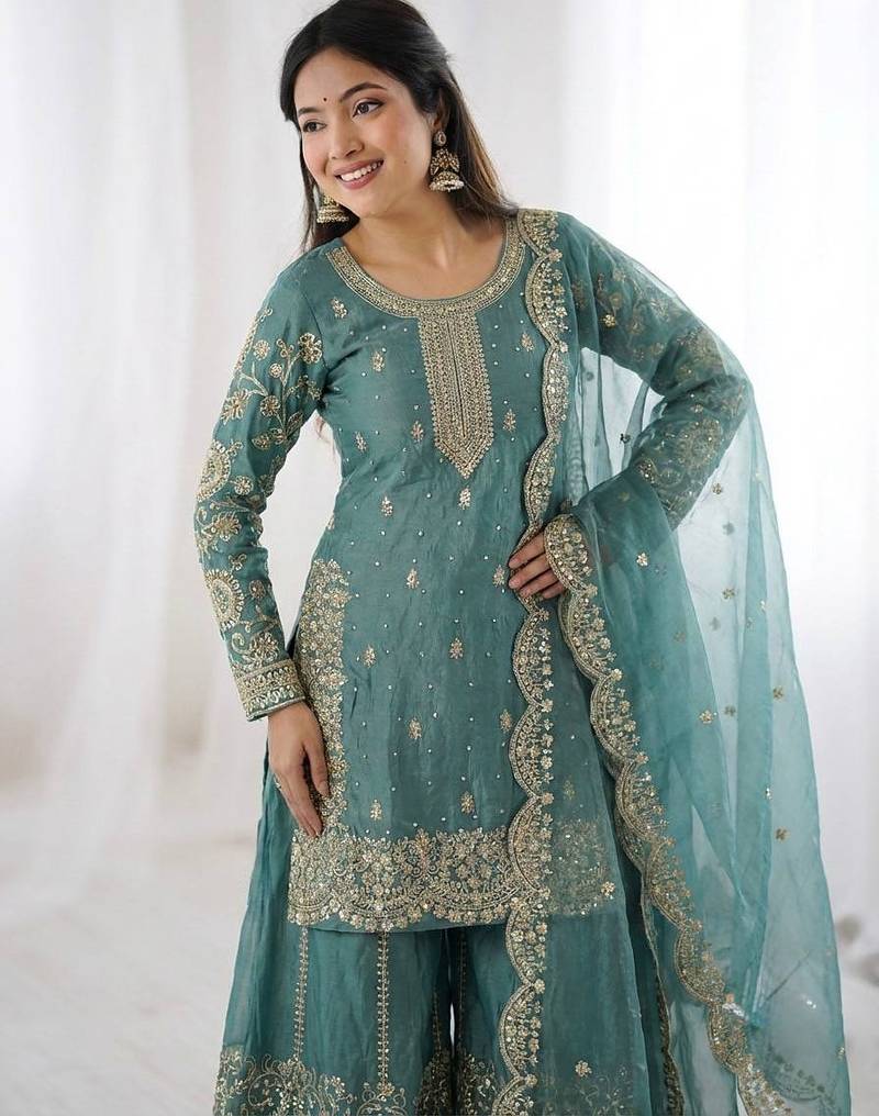 | Product Name | Sky Blue Color Designer Fendy Silk Sequins Embroidered Work Readymade Suit | |