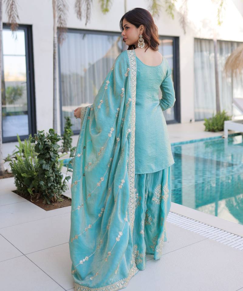 Sky blue designer fendi crush silk sequins embroidered work readymade suit stitched