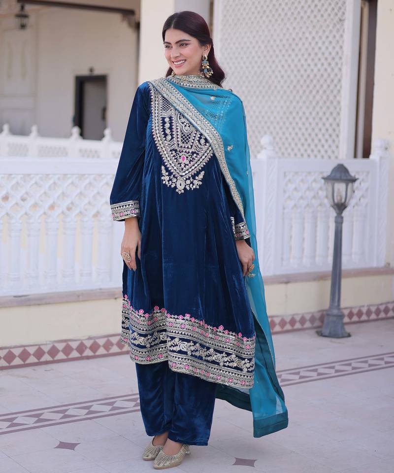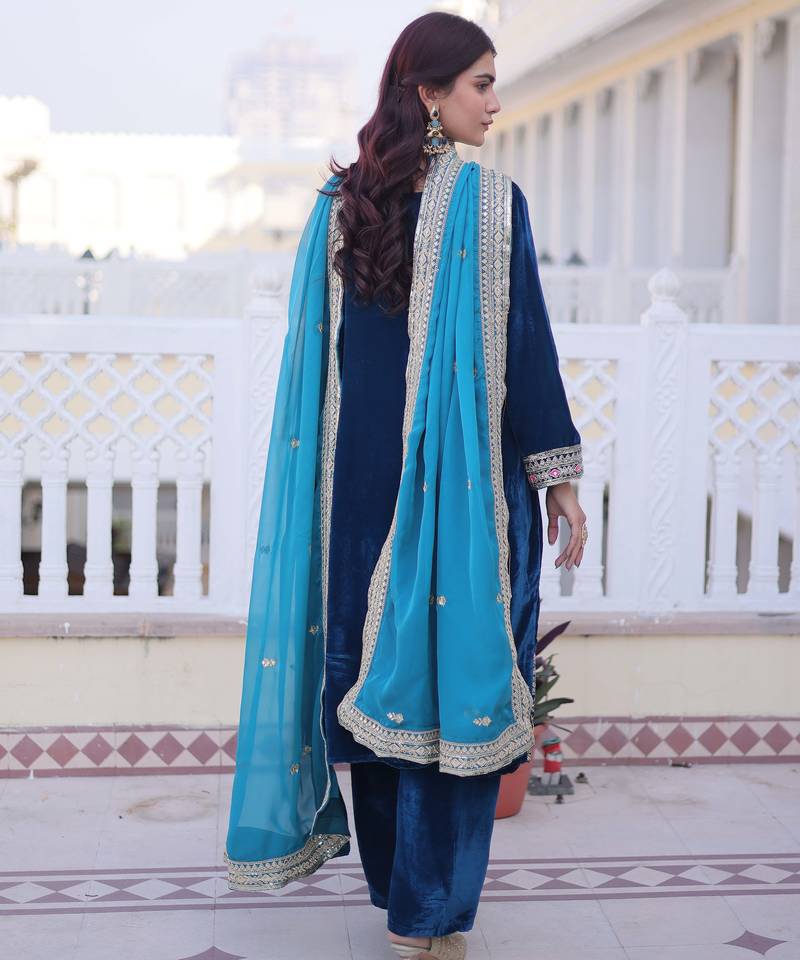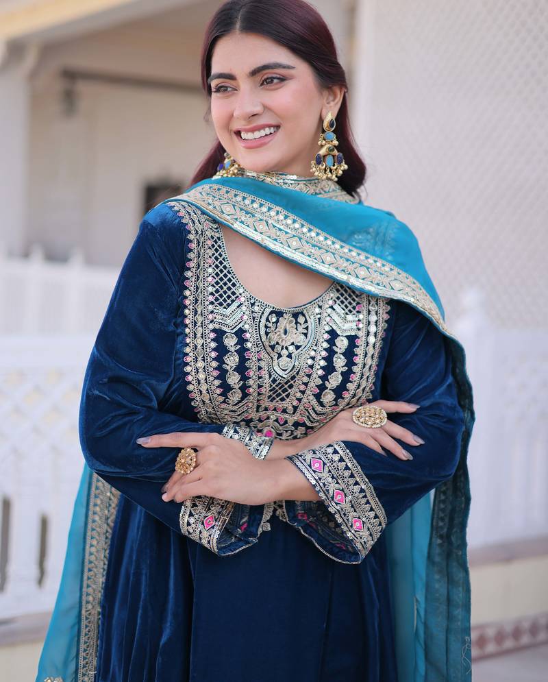 | Product Name | Teal Designer 9000 Velvet Sequins Embroidered Work Readymade Suit | |