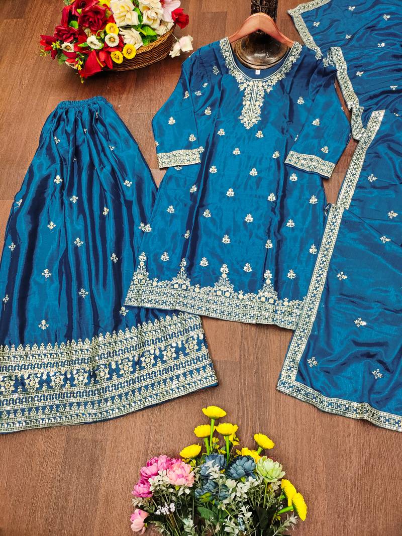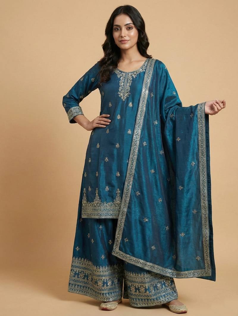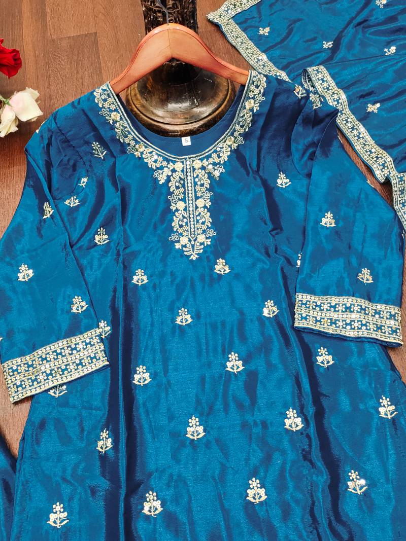 | Product Name | Teal Designer Chinon Sequins Embroidered Work Readymade Suit | |
